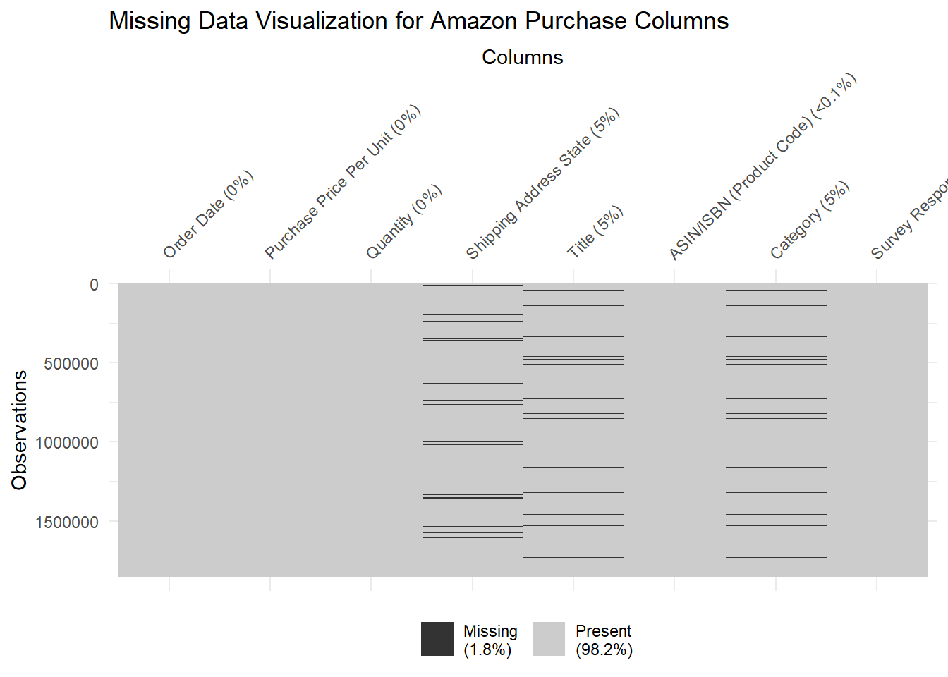 title = "Missing Data Visualization for Amazon Purchase Columns",